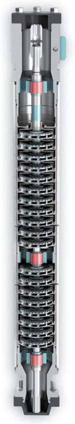 ЭВН состоит из секций, которые в свою очередь состоят из ступеней (направляющих аппаратов) и большого количества рабочих колес собранных на валу и заключенных в стальной корпус (трубу). Ступени собраны в секции, причем подвижная их часть - рабочие колеса, жестко зафиксированные на валу насоса, а неподвижная - направляющие аппараты, собрана в единый корпусный узел. Вал вытачивается из коррозионностойкой жаропрочной криогенной стали ОЗХ14Н7В, направляющие аппараты и рабочие колеса отливаются из модифицированного чугуна ЦН16Д71ХШ или из полиамида, серого чугуна в коррозионно-стойком и обычном исполнении соответственно. Обратный клапан, смонтированный в отдельном модуле насоса - головке, препятствует обратному вращению, облегчает запуск агрегата. В его корпус вкручивается более мелкий предохранительный узел - спускной клапан. Электроцентробежные погружные насосы могут применяться в глубоких и наклонных нефтяных скважинах (даже в горизонтальных), сильно обводненных скважинах, скважинах с йодо-бромистыми водами, с высокой минерализацией пластовых вод, для подъема соляных и кислотных растворов. |